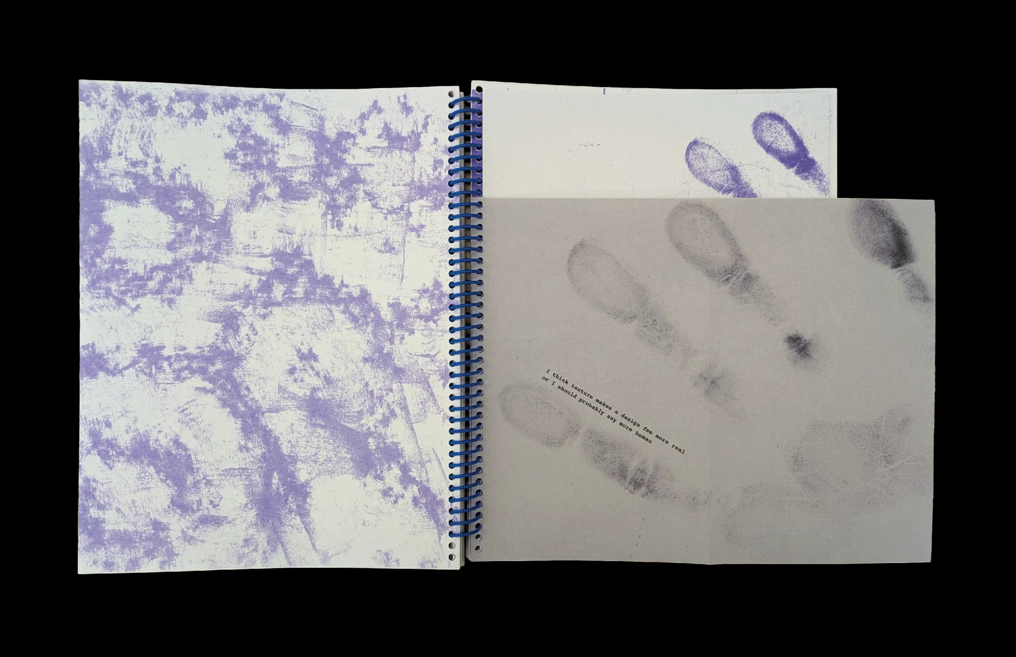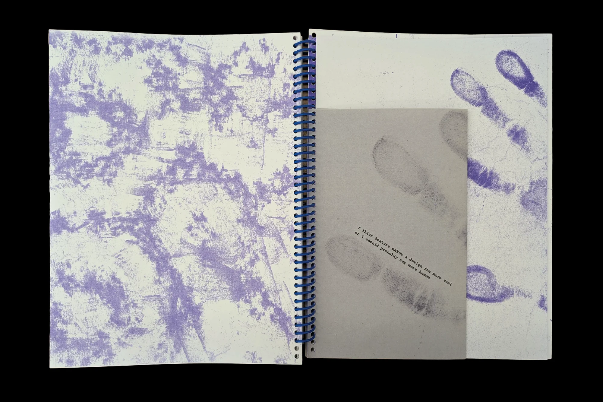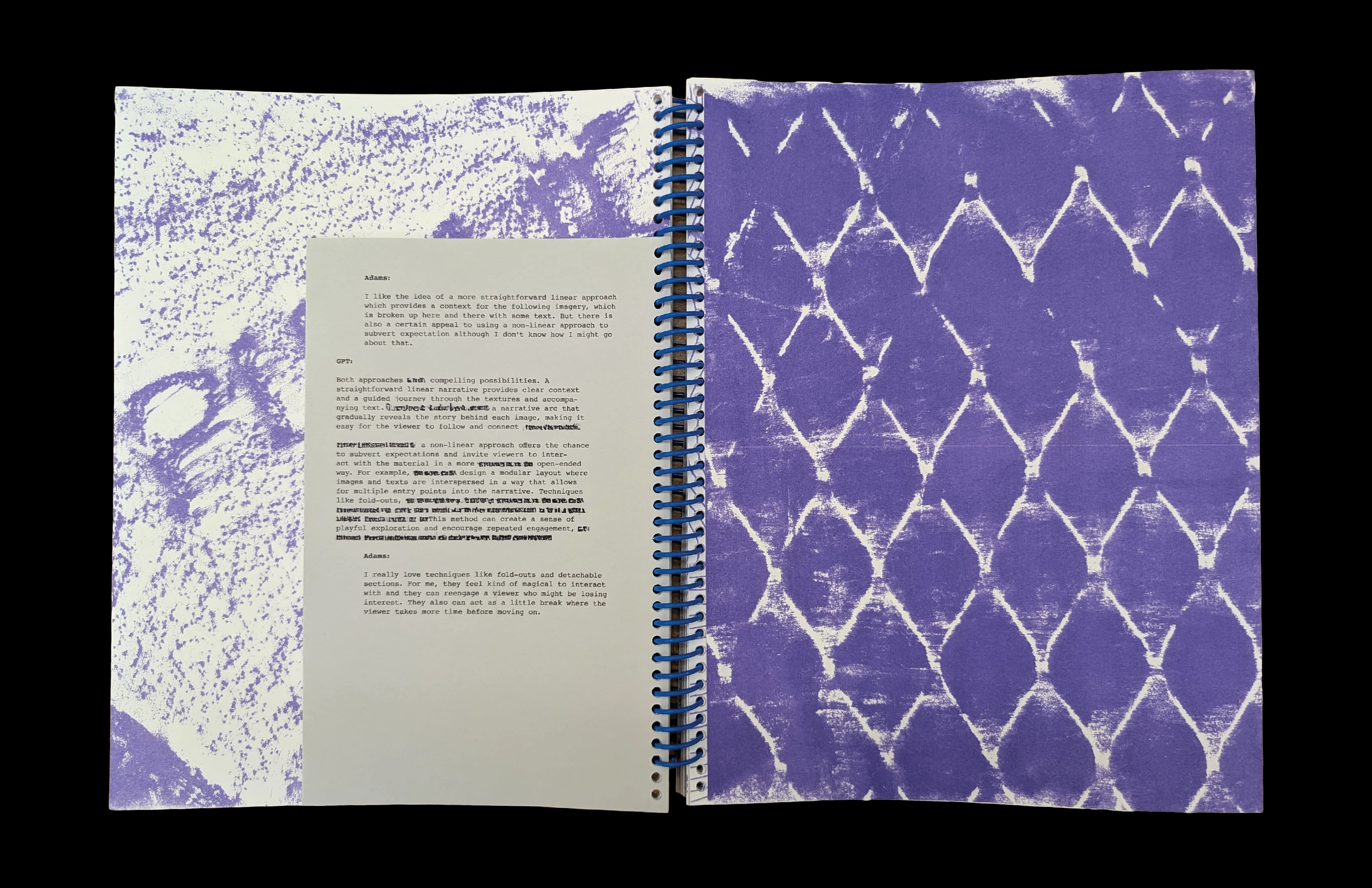 AI&&ME is a spiral bound book using french folded pages and charcoal frottage imagery printed with the risograph. The book explores my experience with AI as a tool during project ideation. The written content functions as a meta-narrative of the creation of the book while also reflecting on some of my own design interests at the time. The risograph printing emphasizes the tactile and physical nature of the imagery and book design in contrast to the digital nature of AI.