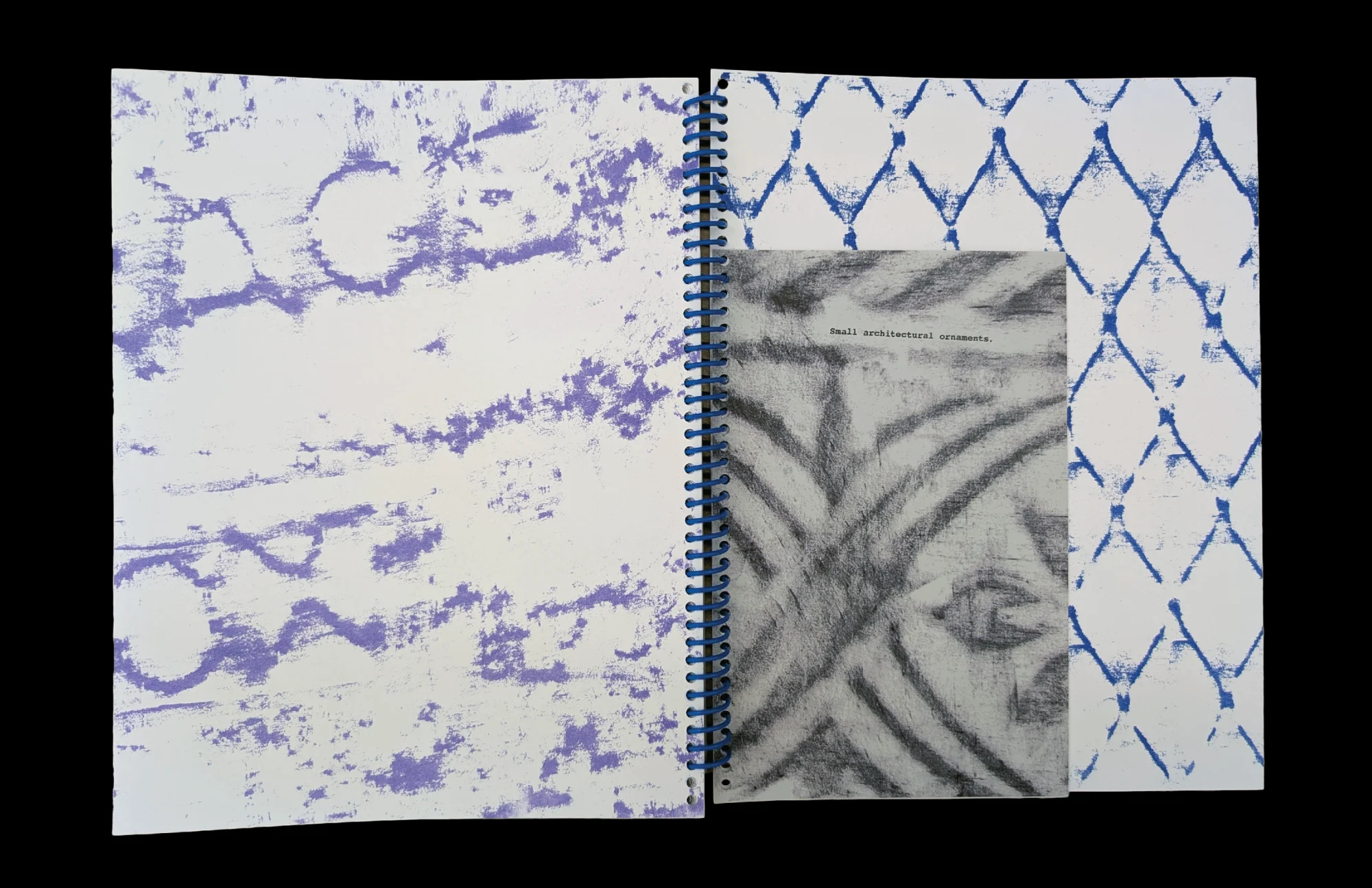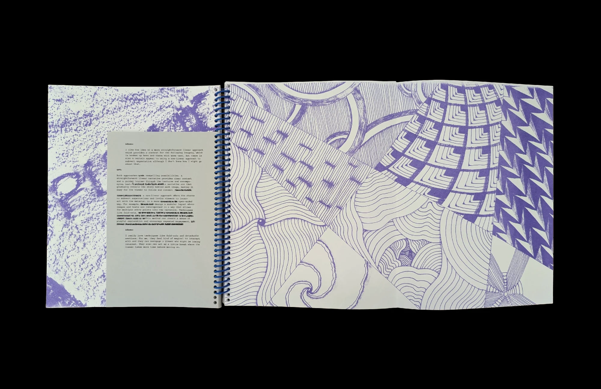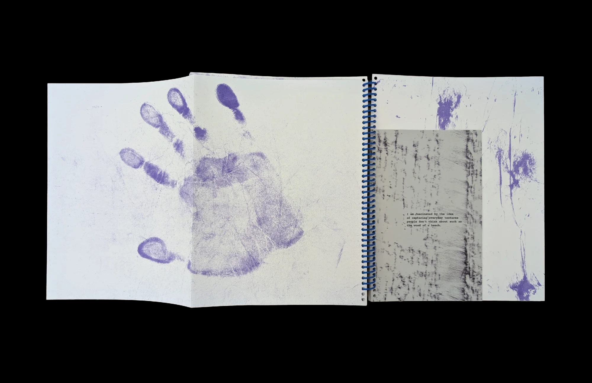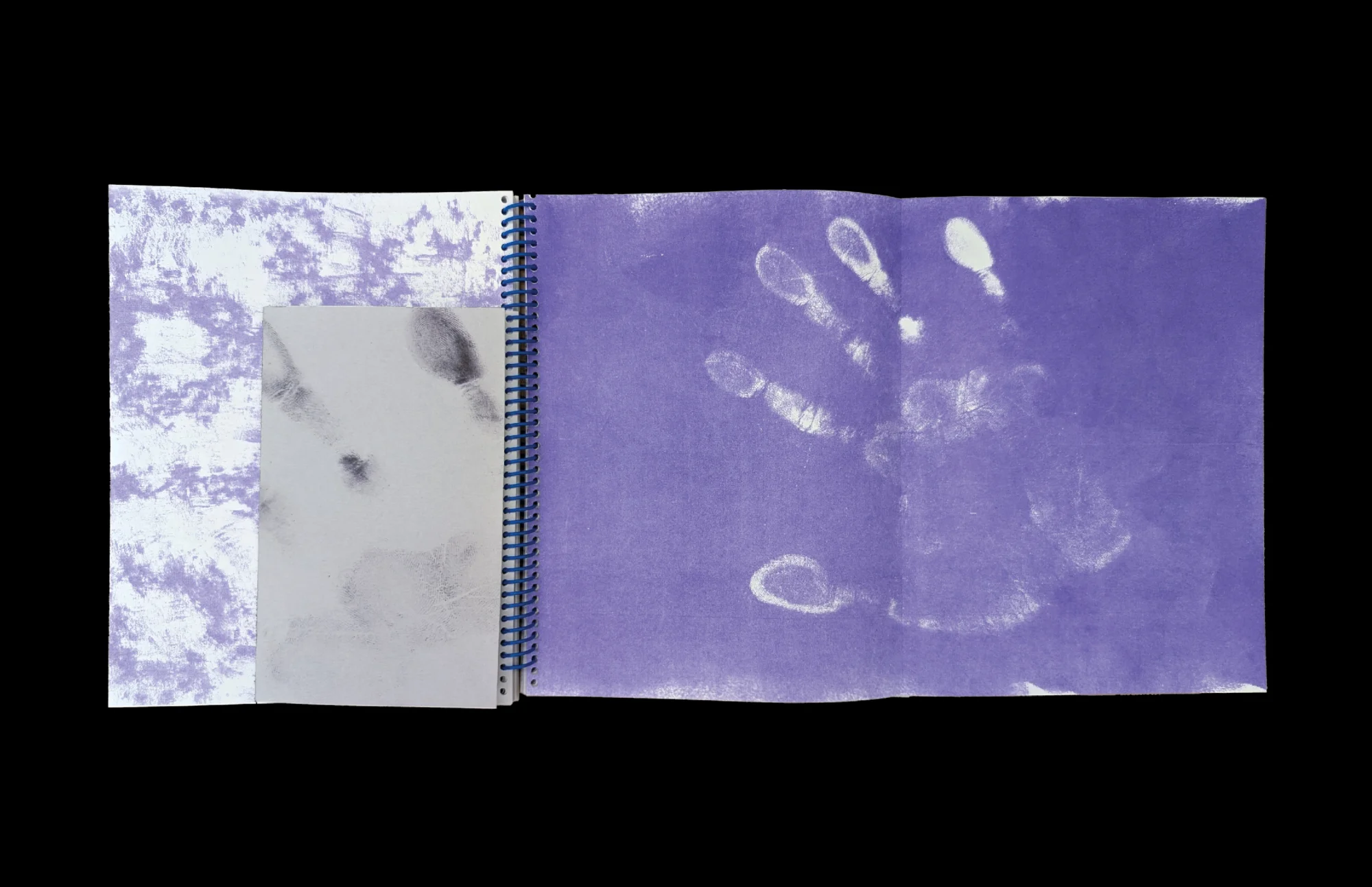 AI&&ME is a spiral bound book using french folded pages and charcoal frottage imagery printed with the risograph. The book explores my experience with AI as a tool during project ideation. The written content functions as a meta-narrative of the creation of the book while also reflecting on some of my own design interests at the time. The risograph printing emphasizes the tactile and physical nature of the imagery and book design in contrast to the digital nature of AI.