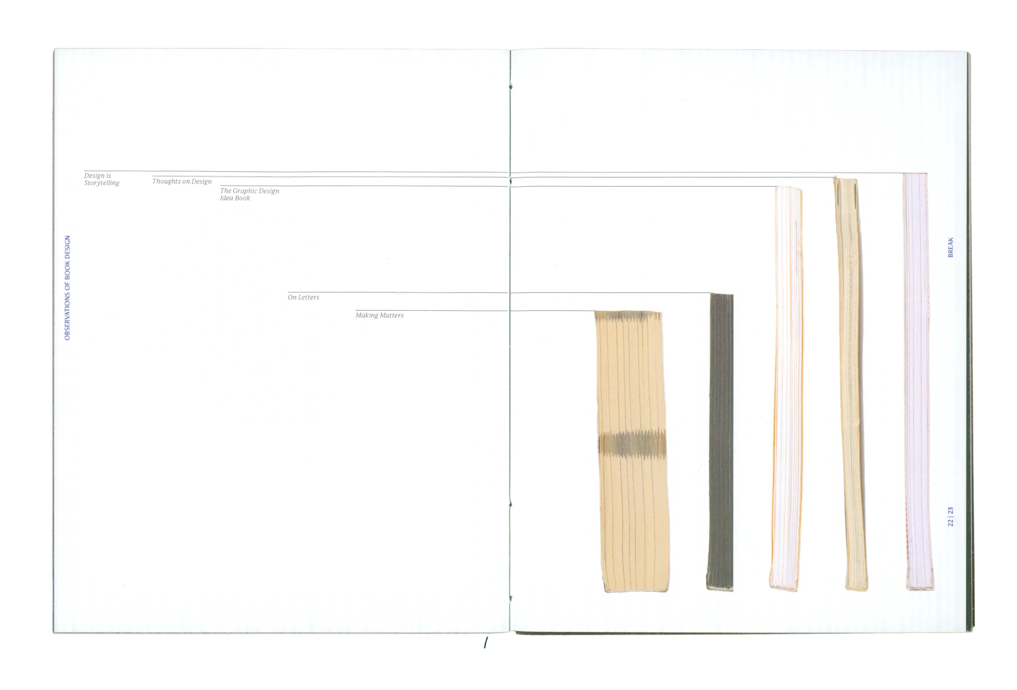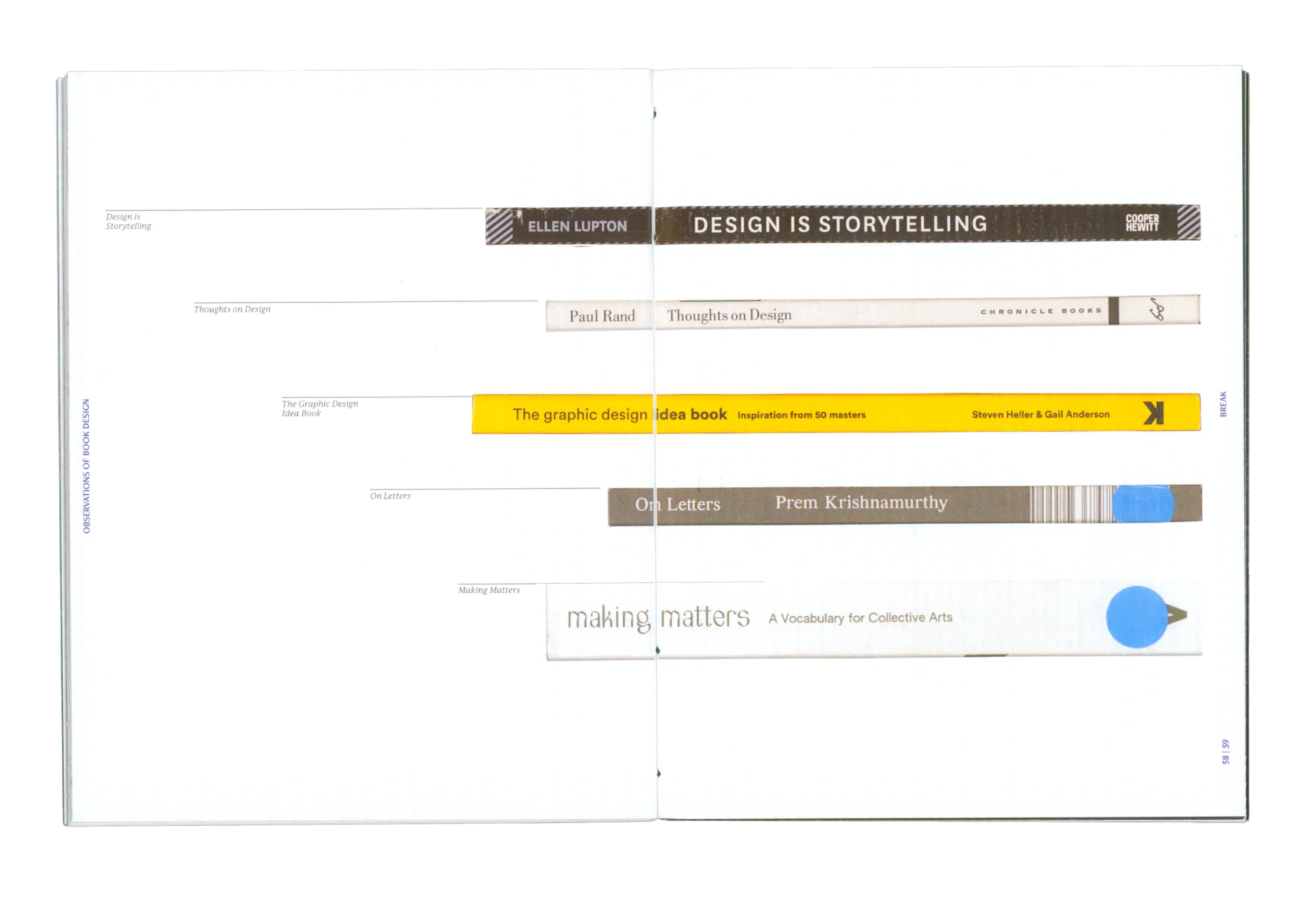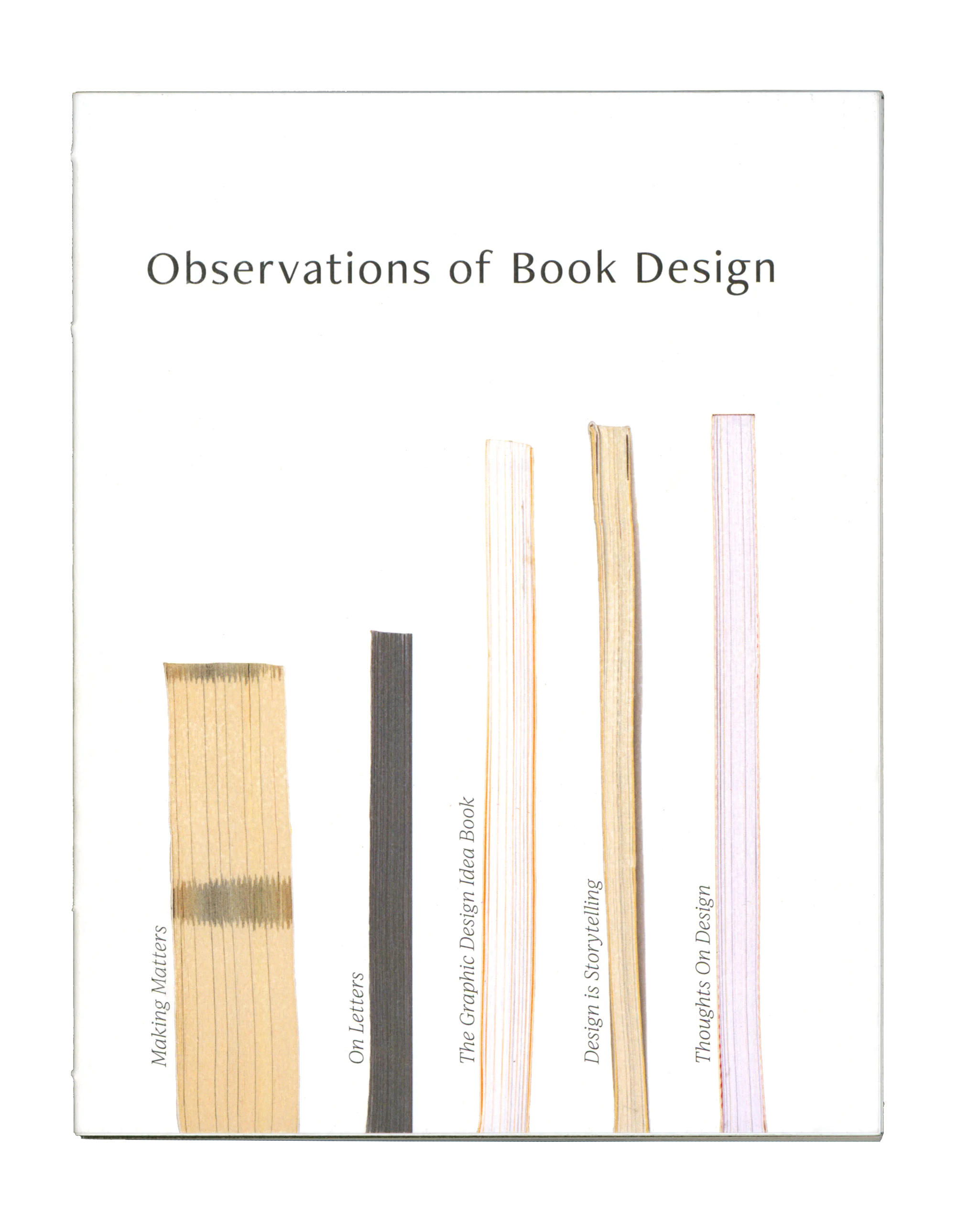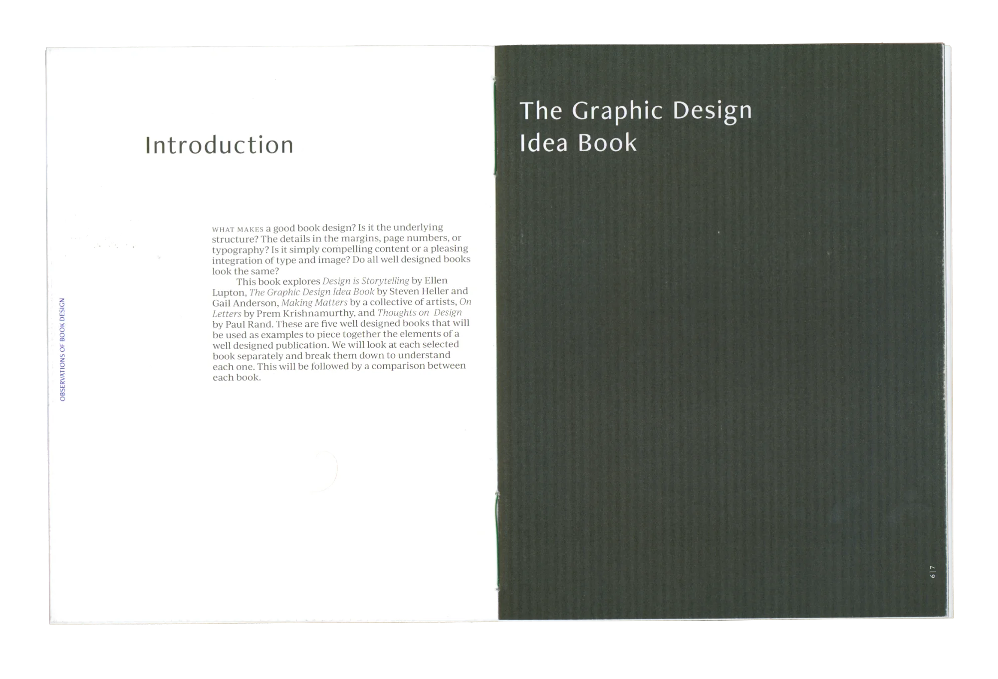 Observations of Book Design analyzes the design and construction of five different design and art related books. It takes a brief look at the different folios, running headers and footers, type systems, and page layouts while providing a few unique comparisons between each book.